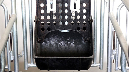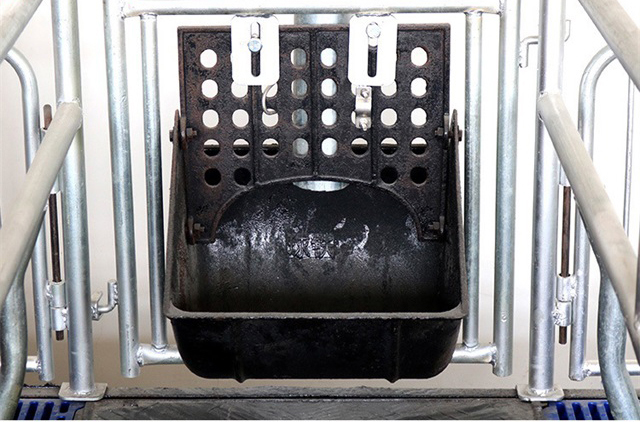 There is a cast iron bowl feeder with large volume on the sow area.