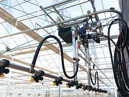 Generally, we adopt a portable sprayer irrigation with center-pivot system. The pivot can be installed on the top of the greenhouse. Meanwhile, sprayers can move in different spans with the help of a transfer device. The system is also equipped with a controller, which control the traveling speed and the spaying amount. Sprinklers are equipped with imported spray nozzles, and each nozzle has 3 spray heads. You can also rotate the spray head to adjust the water spraying amount and spraying shape.